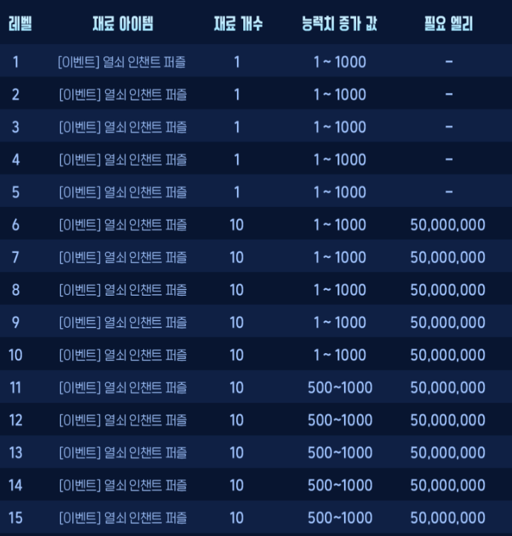 SSR은 15레벨, SR등급은 10레벨까지, 나머지 열쇠는 5레벨까지 인챈트가 가능합니다.