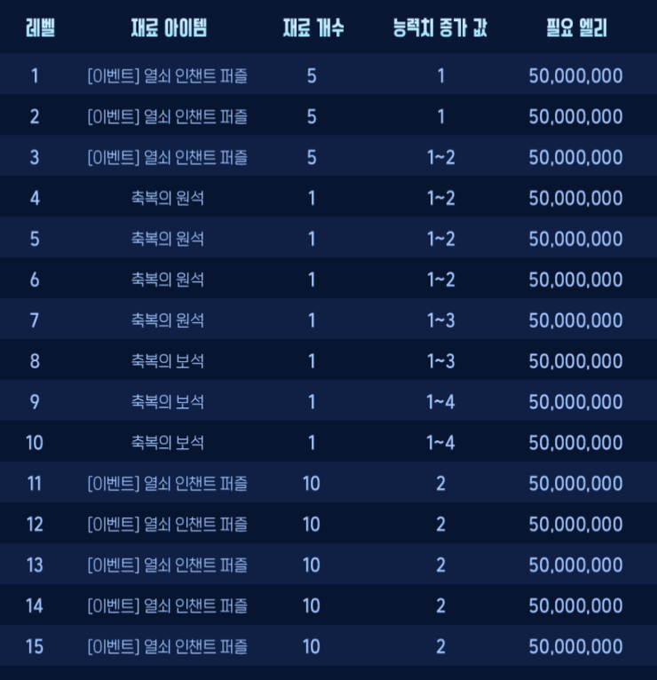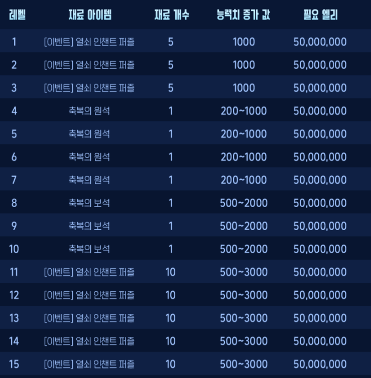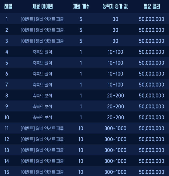 | 축복의 보석 1개 | 축복의 원석 2개, 가이아의 빛나는 열쇠 파편 2개 열쇠 인챈트 퍼즐 5개 + 1억 엘리 |